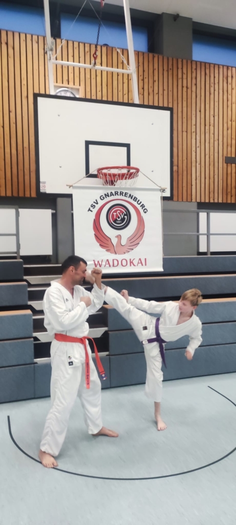 Besonderes Lob erhielt an diesem Tag Daniel Bonge, der mit 52 Jahren der älteste Teilnehmer war und die Prüfung zum orangenen Gürtel bestand. Daniel kam über seinen Sohn Janne zum Karate. „Ich hatte schon immer Interesse, einen Kampsport zu erlernen.“, so Daniel Bonge. Und da der dreizehnjährige Sohn inzwischen auch beim Erwachsenen-Training des TSV mitmachen darf, hat sich Daniel Bonge entschieden, mit ihm gemeinsam zum Training zu gehen. Was Karate angeht hat allerdings der Sohn die größere Erfahrung gegenüber dem Vater und ist der höher graduierte Karateka. Janne bestand die Prüfung zum violetten Gürtel. Insgesamt hatten bestanden zum Gelbgurt: Mattes Albers, Nalina Postels, Lukas Gerken. Zum Orangegurt: Emil Kotza, Felix Taege, Timon Otten, Anton Gudella , daniel Bonge. Zum Grüngurt: Hannah Gerdes. Zum Blaugurt: Lasse Pragmann. Zum Violettgurt: Tom Pragmann , Janne Stranz und Jan Beetstra. Zum Braungurt: Lena Zeidler.